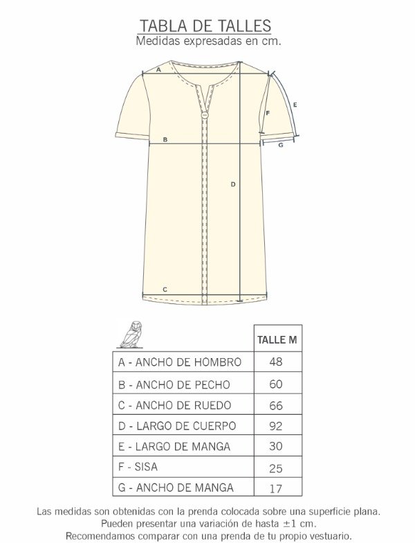 Túnica manga corta, cuello redondo. Con detalle de botón cerámico y bolsillos laterales. Y con tajos laterales