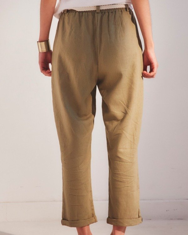 Pantalón con bolsillos laterales. Cintura con elástico y lazo de algodón.