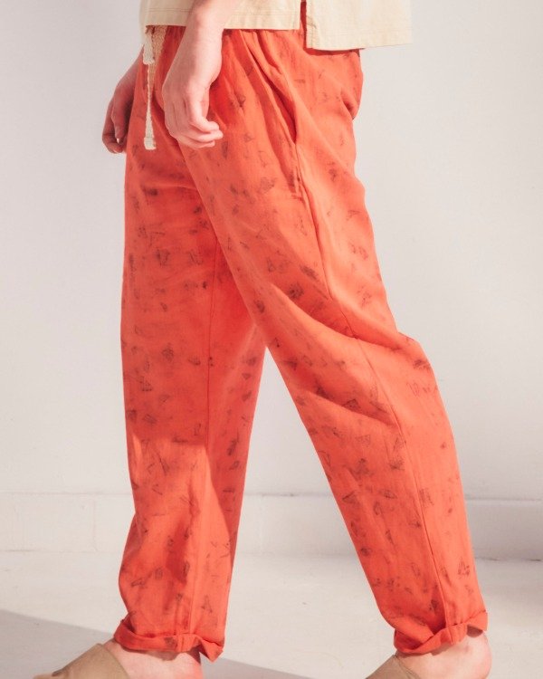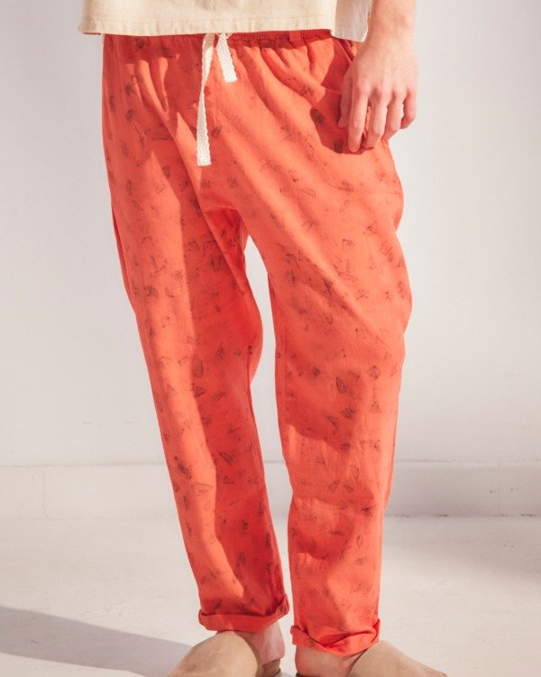 Pantalón con bolsillos laterales. Cintura con elástico y lazo de algodón.