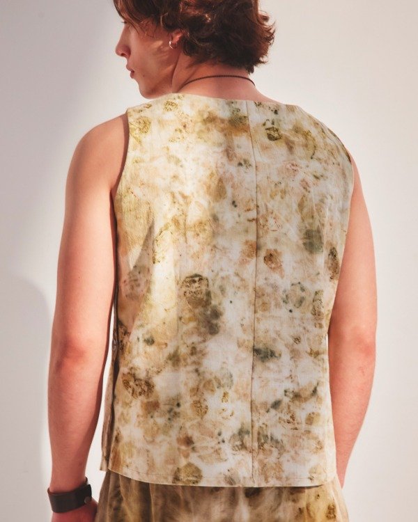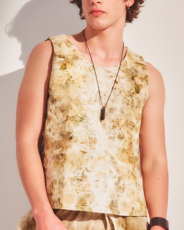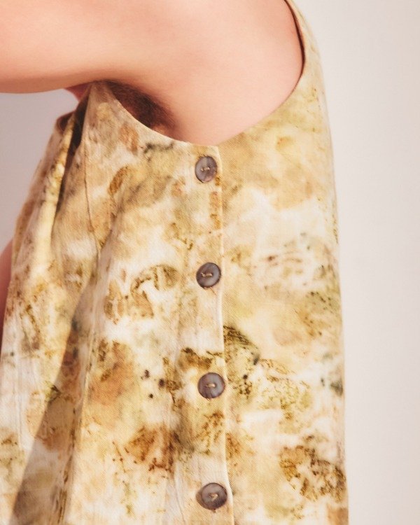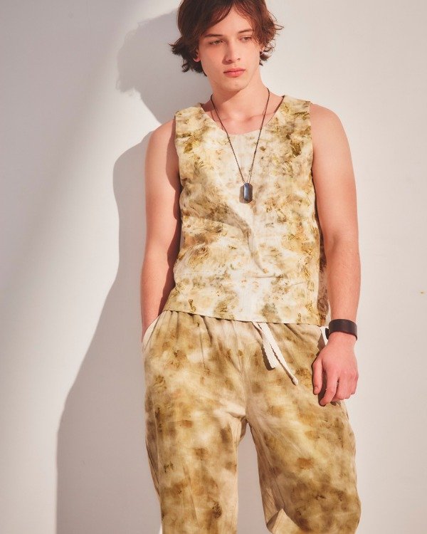 Usamos la técnica de estampa “Ecoprint”, con cáscaras de cebolla. Sustentable, libre de químicos.
