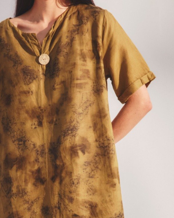 Túnica manga corta, cuello redondo. Con detalle de botón cerámico y bolsillos laterales. Y con tajos laterales