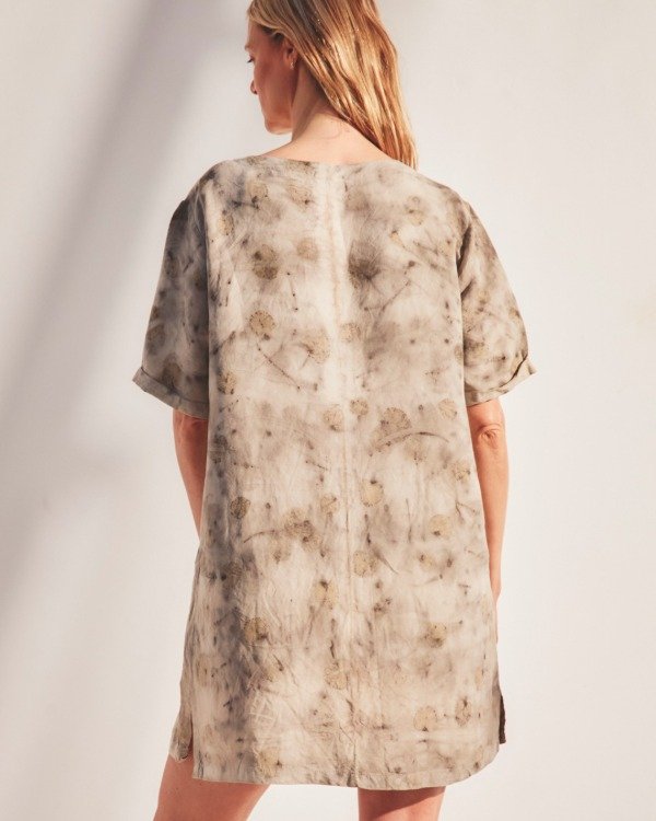 Túnica manga corta, cuello redondo. Con detalle de botón cerámico y bolsillos laterales. Y con tajos laterales