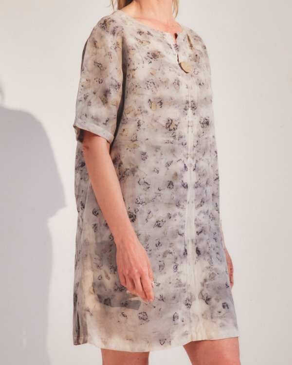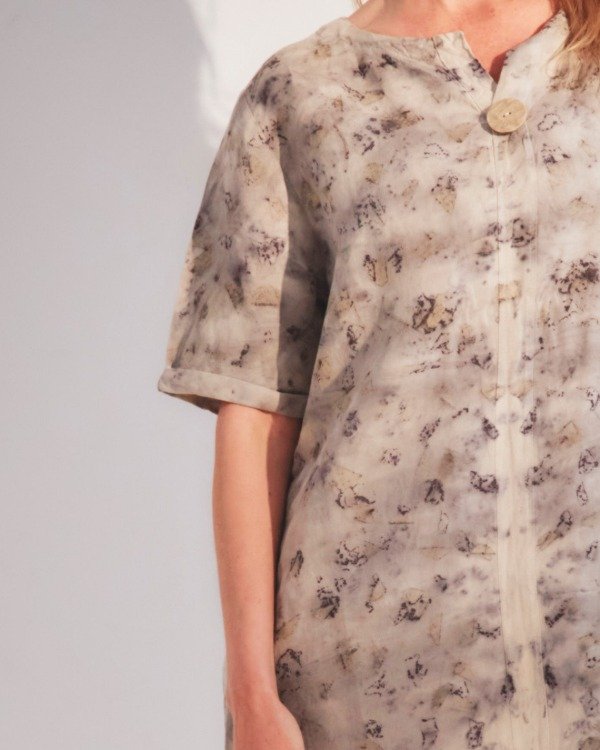 Túnica manga corta, cuello redondo. Con detalle de botón cerámico y bolsillos laterales. Y con tajos laterales