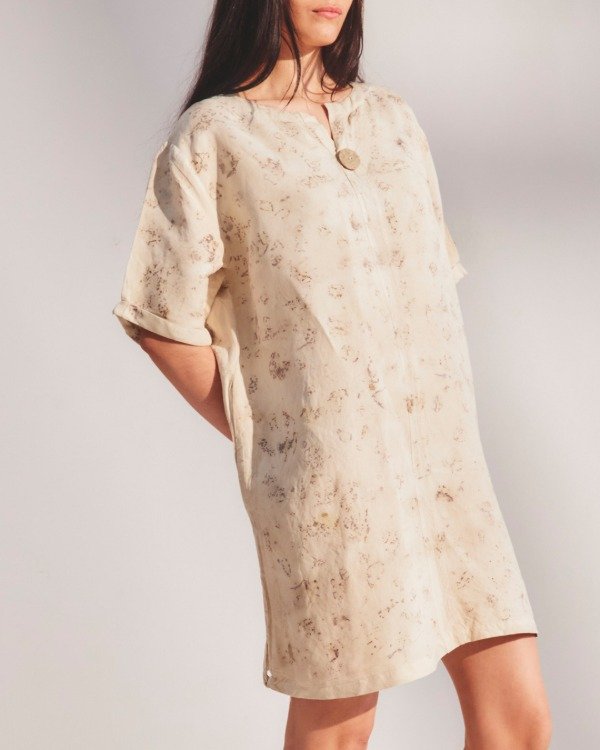 Túnica manga corta, cuello redondo. Con detalle de botón cerámico y bolsillos laterales. Y con tajos laterales