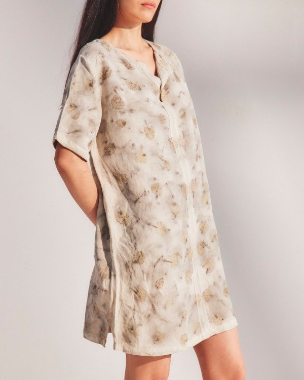 Túnica manga corta, cuello redondo. Con detalle de botón cerámico y bolsillos laterales. Y con tajos laterales